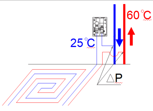 где Q — тепловая мощность системы, Вт; с — удельная теплоёмкость теплоносителя, Дж/кг °С; ∆Т — разность температур между прямым и обратным теплоносителем, °С.В системах радиаторного отопления перепад температур ∆Т обычно составляет порядка 20 °С, а в системах напольного отопления ∆Т = 5–10 °С.