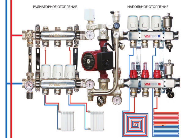 Узел адаптирован для присоединения к нему коллекторных блоков с межосевым расстоянием 200 мм и горизонтальным смещением между осями коллекторов 32 мм. При этом коллекторные блоки могут присоединяться как на входе, так и на выходе насосно-смесительного узла. Это позволяет использовать этот узел в комбинированных системах отопления (рис. 4), где отопление тёплым полом совмещается с радиаторным отоплением.