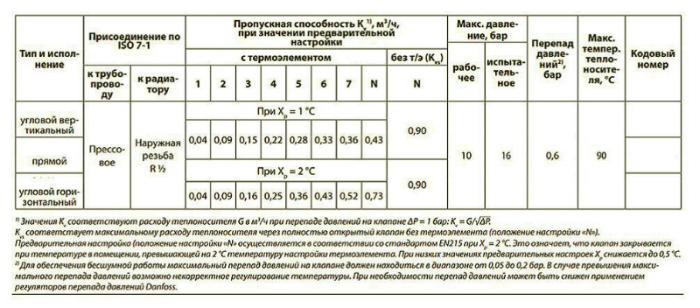 Основной гидравлической характеристикой термостатического клапана является пропускная способность Kv. Это расход воды, который способен пропустить через себя клапан при перепаде давления на нем в 1 бар. Индекс «V» обозначает, что коэффициент отнесен к часовому объемному расходу и измеряется в м3/ч. Зная пропускную способность клапана и расход воды через него, можно определить потерю давления на клапане по формуле: