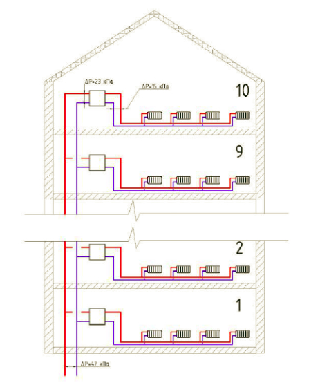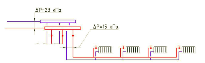В этом случае регулятор перепада давления можно расположить перед этажным коллектором и настроить его на перепад 15 кПа. Такая схема позволяет сократить количество регуляторов перепада давления и существенно удешевить систему.