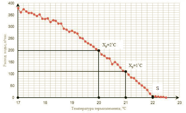 Отсюда можно сделать вывод, что температура воздуха в помещении будет колебаться в пределах от 20 до 22 ˚С. Показатель Xp влияет на точность поддержания температуры. При Xp = (S – 1) диапазон поддержания температуры внутреннего воздуха будет в пределах 1 ˚С. При Xp = (S – 2) – диапазон 2 ˚С. Зона Xp = (S – max) характеризует работу клапана без термочувствительного элемента.