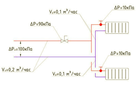 Допустим, что потери давления на каждом термостатическом клапане составляет 10 кПа, потери давления на вентиле – 90 кПа, общий расход теплоносителя – 0,2 м3/ч и расход теплоносителя через каждый радиатор – 0,1 м3/ч. Потерями давления в трубопроводах пренебрегаем. Полные потери давления в этой системе составляют 100 кПа, и они поддерживаются на постоянном уровне. Гидравлику такой системы можно представить следующей системой уравнений: