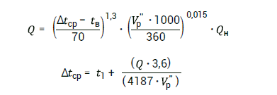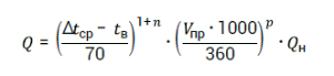 где Qн – номинальная мощность отопительного прибора, Вт, Δtср – средняя температура отопительного прибора, ˚С, tв – температура внутреннего воздуха, ˚С, Vпр – расход теплоносителя через отопительный прибор, n – коэффициент зависимости теплоотдачи от средней температуры прибора, p – коэффициент зависимости теплоотдачи от расхода теплоносителя.