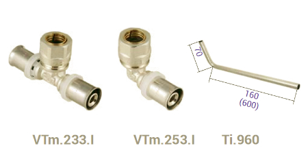 Прокладываемые внутри профильного плинтуса трубы соединяются с отопительными приборами с помощью специальных «плинтусных» фитингов. На рис. 16 приведен пример использования пресс-фитингов VTm.233i и VTm.253i (рис. 17) для присоединения к радиаторным термостатическим узлам бокового подключения.