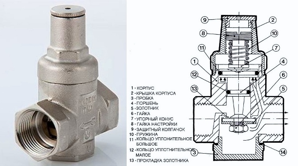 Давление на входе Рвх воздействует на малый поршень, стремясь его открыть. За счет дросселирования в золотнике, связанном с малым поршнем, давление уменьшается до Pвых. Это пониженное давление воздействует на большой поршень, стремясь закрыть золотник. Пружинабольшого поршня поддерживает золотник открытым, когда давление на входе ниже настроечного. Вместо большого поршня может использоваться мембрана. Вноменклатуре компании VALTEC имеются редукторы давления четырех типов. Они широко используются в квартирных узлах ввода водопровода.