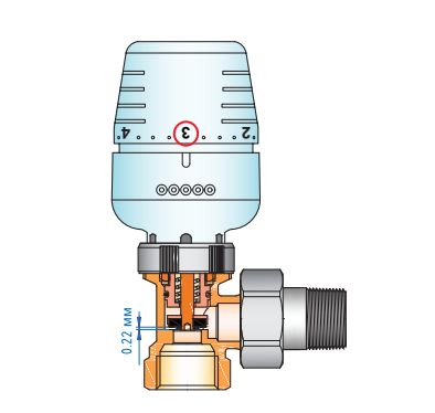 Третий существенный недостаток терморегуляторов с термоголовками заложен в самом принципе их работы. При настройке в позицию «3», соответствующую, как правило, температуре воздуха +20 °С, золотник термостатического клапана поднят от седла всего на 0,22 мм (рис. 10).