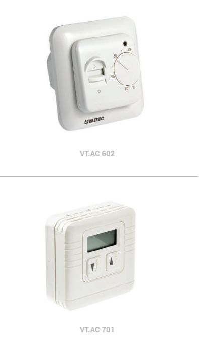 У простейших комнатных термостатов, таких как VT.AC701 и VT.АС602 (рис. 13), есть лишь две функции: измерение температуры воздуха и переключение контактов при отклонении этой температуры от заданной.