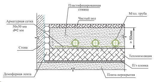 После установки демпферной ленты на перекрытие укладывается полиэтиленовая пленка для защиты от протекания цементного молока из раствора и слой теплоизоляции для предотвращения утечки тепла в нижележащие помещения. В качестве теплоизоляции используются вспененные материалы (полистирол, полиэтилен и т.п.) или фольгированные теплоизоляционные материалы. Важно, чтобы фольгированные теплоизоляционные материалы имели защитную пленку на алюминии. В противном случае, щелочная среда бетонной стяжки разрушает фольгированный слой в течение 3–5 недель. Для придания прочности цементно-песчаной стяжки укладывается арматурная сетка.