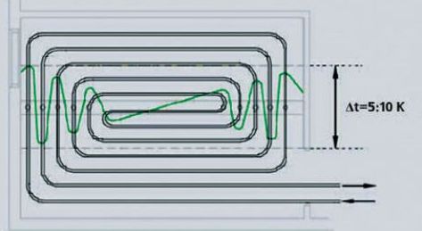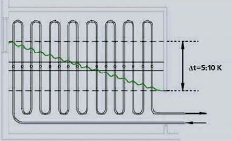 При укладке «одиночный змеевик» (рис. 2) распределение температуры поверхности пола неравномерное.
