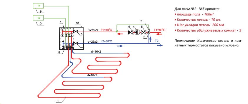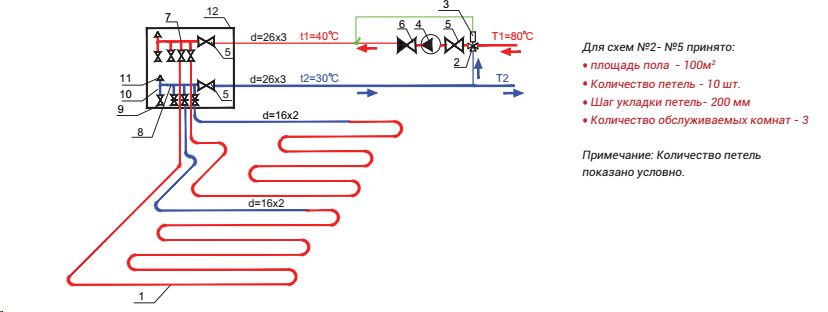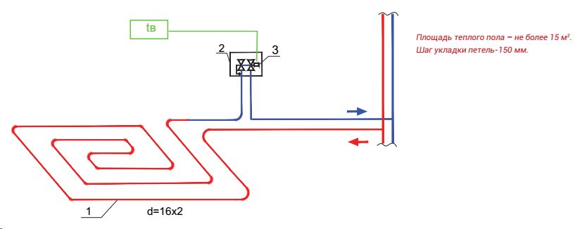 Такая схема используется при теплоносителе в подающем трубопроводе с температурой до 60 °С. При более высоких температурах теплоносителя необходимо применять специальные технические решения (частичное использование «теплой стены»; применение поризованных стяжек, теплоизоляция труб). К преимуществам данной схемы относится ее простота и экономичность. Её рекомендуется использовать при укладке теплого пола в небольших помещениях, учитывая, что один монтажный узел VT.ICBOX может обслужить только одну петлю теплого пола протяженностью не более 100 м. Коллектор и насосно-смесительный узел для такой схемы не требуются.