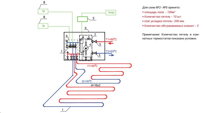 Балансировка петель между собой осуществляется регулировочными вентилями, входящими в состав обратного коллектора (поз. 8). Схема является достаточно простой и работоспособной. Регулирование теплоотдачи теплого пола осуществляется настройкой термоголовки или сервоприводом. Автоматическое поддержание температуры в каждом отдельном помещении отсутствует.