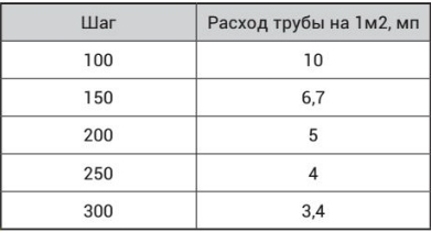 Укладка трубы производится по разметке, нанесенной на теплоизоляцию. Трубы крепятся якорными скобами через 0,3–0,5 м, либо удерживаются специальными выступами теплоизоляционных матов. Шаг укладки определяется расчетом и лежит в пределах от 10 до 30 см. Шаг труб не должен превышать 30 см, в противном случае возникнет неравномерный нагрев поверхности пола с появлением теплых и холодных полос. Для удобства расчета расхода трубы в зависимости от шага трубы и площади помещения можно воспользоваться таблицей 1.