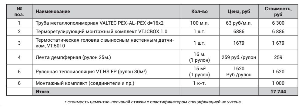 Таблица 2. Спецификация материалов «теплого пола» для схемы № 1 (площадь пола 15 м2)