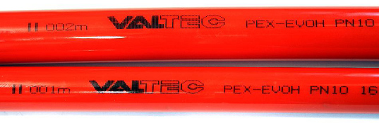 Торговая марка VALTEC предлагает полиэтиленовые трубы PEX-EVOH, выполненные их сшитого полиэтилена PE-Xb. Снаружи на трубу нанесен антидиффузионный слой EVOH с толщиной 50 мкм. Наружный и внутренний слои трубы связаны между собой с помощью эластичного клея Plexar PX 3216.