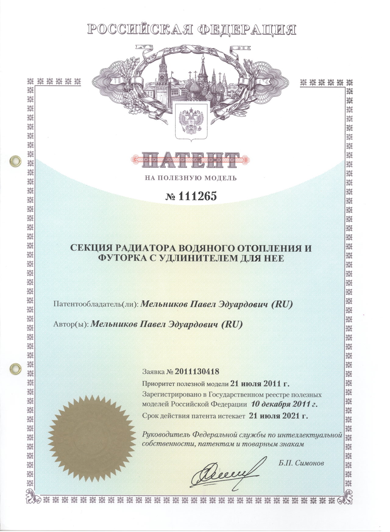 Патент № 111265. Автор: Мельников Павел Эдуардович