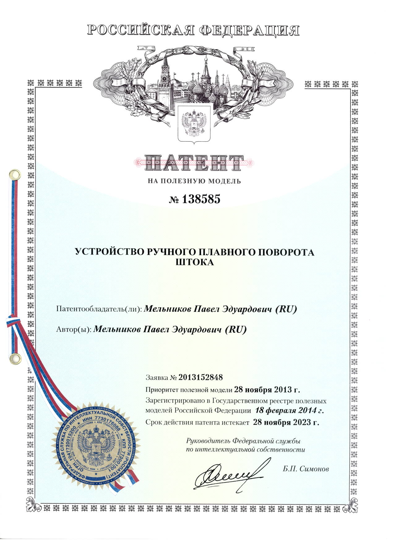 Патент № 138585. Автор: Мельников Павел Эдуардович