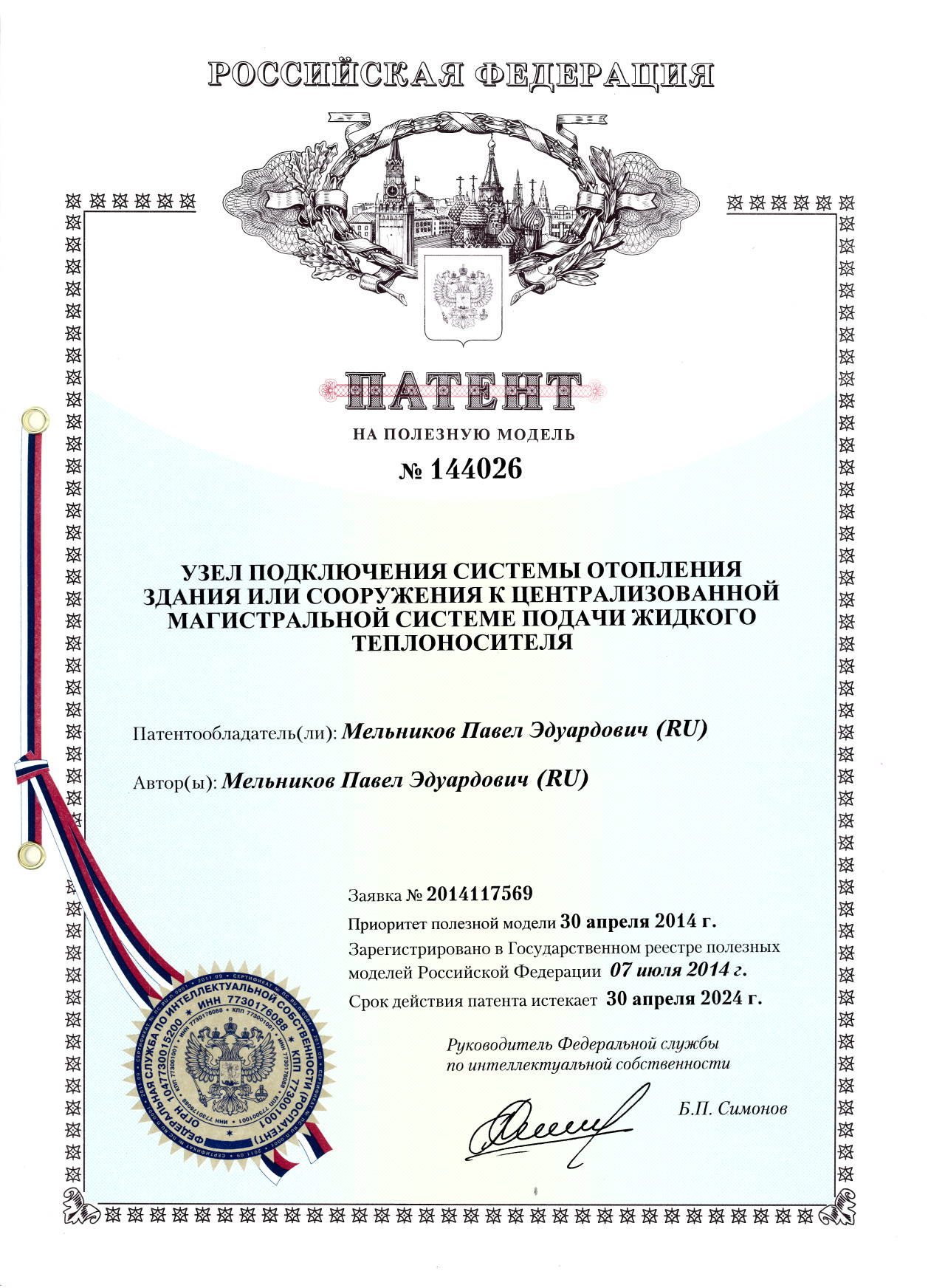 Патент № 144026. Автор: Мельников Павел Эдуардович